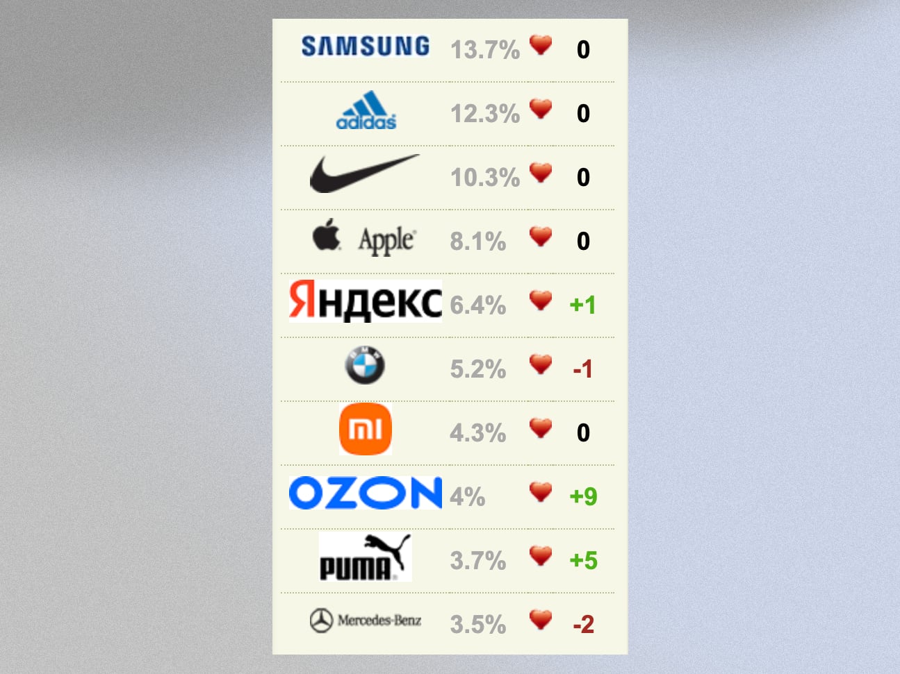 В 2025 году в рейтинге усилили позиции российские бренды. Яндекс поднялся на четвёртое место, Ozon — на пятое, а Wildberries впервые попал в рейтинг и занял сразу восьмое место.