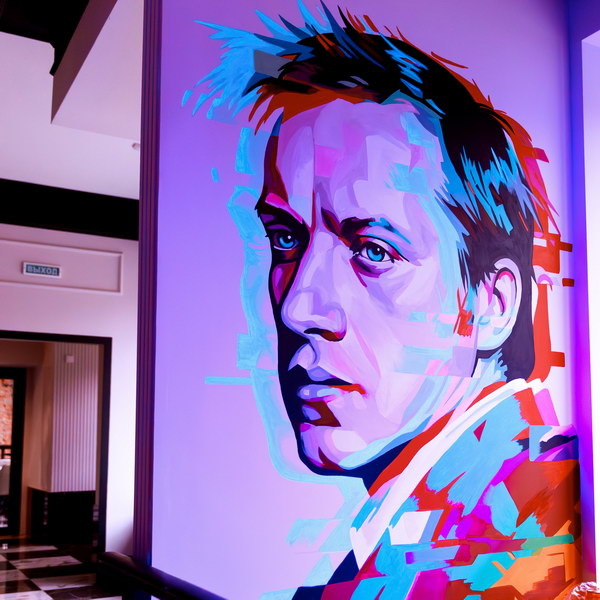 - Портрет создан как яркая флуоресцентная роспись, объединяющая реалистичность и современную глитч-эстетику. Лицо изображено в полуобороте, с выражением собранности и внутренней силы — качеств, определявших творческий стиль Сергея Арцибашева и его многолетнюю связь с Театральным особняком на Покровке — делится своим видением художник Владислав Подопригора.
