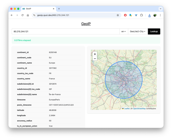 - Предоставление готового Docker-образа для быстрого развертывания: docker run \ -e MAXMIND_ACCOUNT_ID=XXXX \ -e MAXMIND_LICENCE_KEY=YYYY \ -e OSM_TILES_URL="https://{s}.tile.openstreetmap.org/{z}/{x}/{y}.png" \ # необязательно -v geoip_data:/data \ -p 8080:8080 \ ghcr.io/quoi-dev/geoip:latest