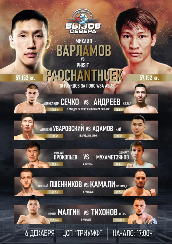 Турнир «Вызов Севера» обещает стать одним из самых ярких событий финала сезона - c насыщенным кардом, громкими именами и интригами, которые будут решены только в ринге. На турнире "Вызов Севера" Назар Андреев и Александр Сечко будут бороться за пояс чемпиона России, а Михаил "Полярный волк" Варламов сразиться с чемпионом Таиланда Физитом Паочаунтэком за пояс WBA Asia.