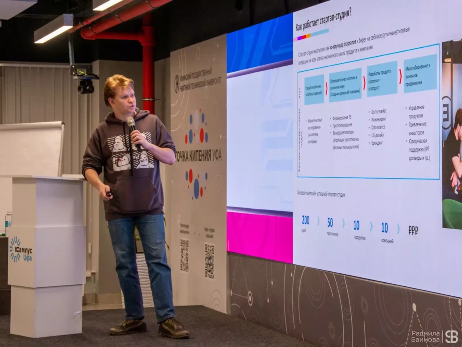 Директор Стартап-Студии УГНТУ Владимир Бекасов рассказал о механизмах получения инвестиций для проектов и отметил полезность инфраструктуры кампуса для формирования кооперации между университетами, бизнесом и проектами студии. Он призвал студентов и преподавателей не бояться рисков и активно заниматься технологическим предпринимательством.