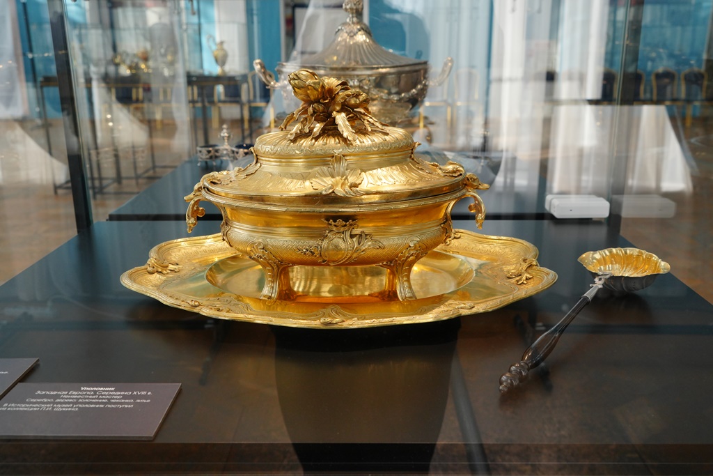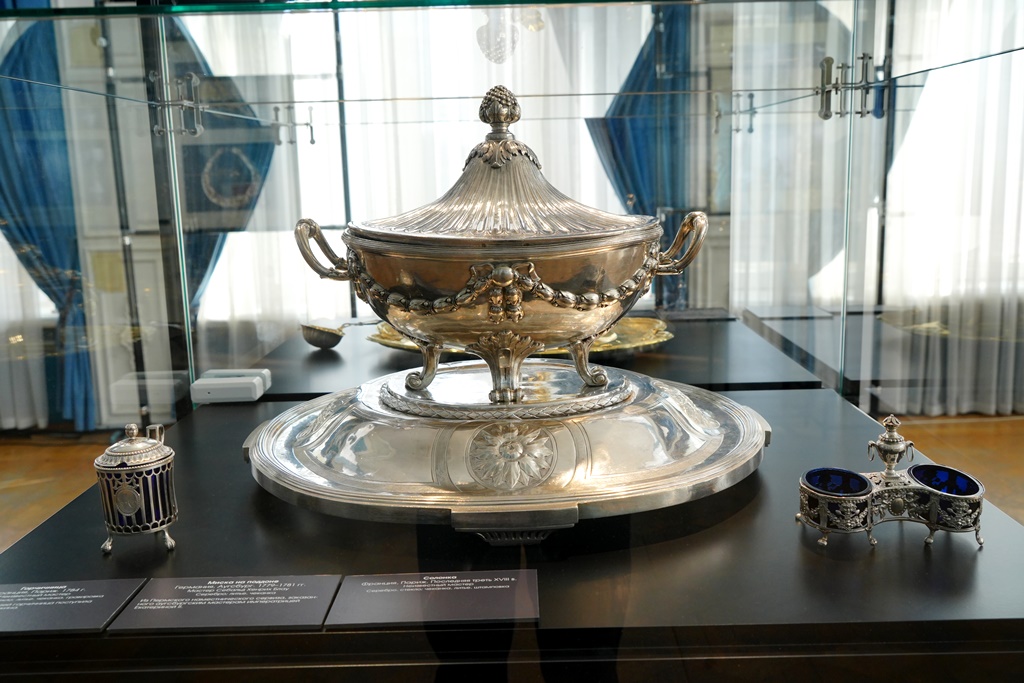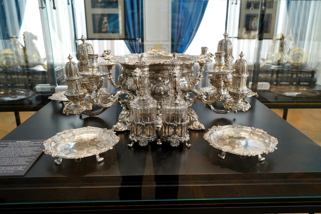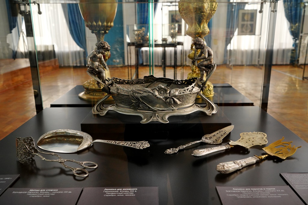 В экспозицию вошли различные виды питьевой и столовой посуды, приборы и предметы для сервировки стола, а также предметы для украшения интерьера. Так, посетители могут увидеть кубок, выполненный Бартелем Ямницером — представителем известной нюрнбергской династии ювелиров XV — начала XVII века. Кроме того, на выставке представлена серебряная чаша, вес которой более 12 килограммов. Она принадлежала семье графа Ивана Паскевича — выдающегося полководца XIX века, связанного с историей Астрахани и Кавказа. Предмет создан варшавским ювелиром Каролем Ежи Лильпопом в стиле ампир.