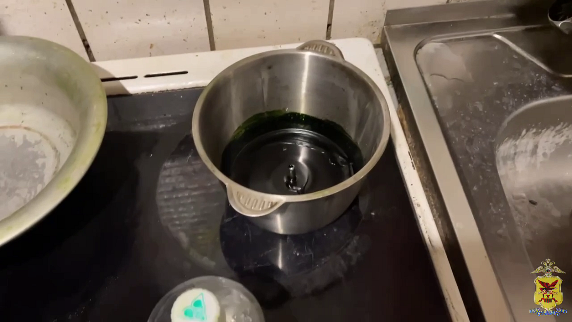 При осмотре помещения оперативники обнаружили улики, не вызывающие сомнений в характере незаконной деятельности хозяина квартиры. Возле раковины на полу лежал пакет с измельчёнными и высушенными листьями, обладающими характерным запахом конопли. В одной из кастрюль была найдена жидкость тёмно‑зелёного цвета.