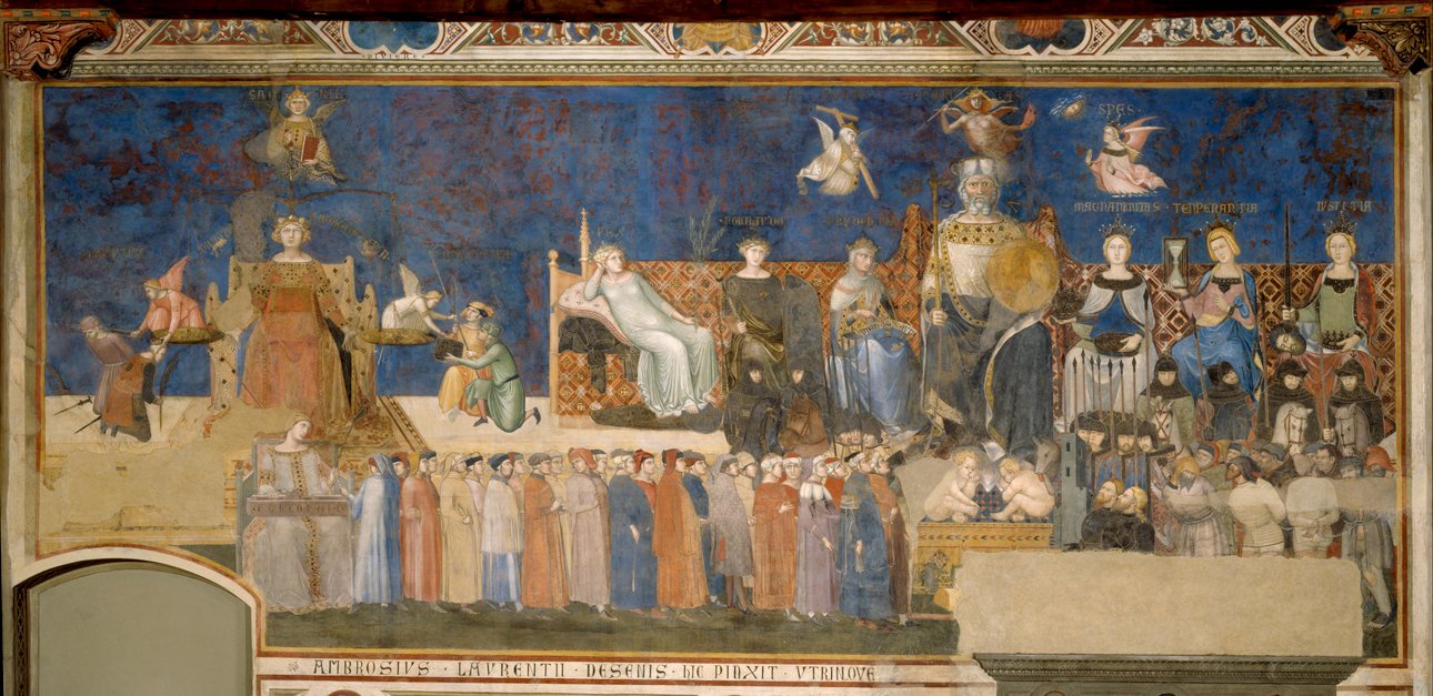 То же самое можно сказать о философских по содержанию и чрезвычайно политизированных фресках, написанных Лоренцетти в зале Девяти в Сиенской ратуше в 1338–1339 годах. В росписях, покрывающих три стены помещения, справа он изобразил ухоженный город — пример «доброго правления», а на левой стене — тот, где царят насилие, раздоры и жадность — плоды «дурного правления». Фигура Мира изображена в конце зала, а не по центру стены и выглядит неожиданно отстраненной. Это, вероятно, одно из наиболее часто воспроизводимых изображений в сиенском искусстве.