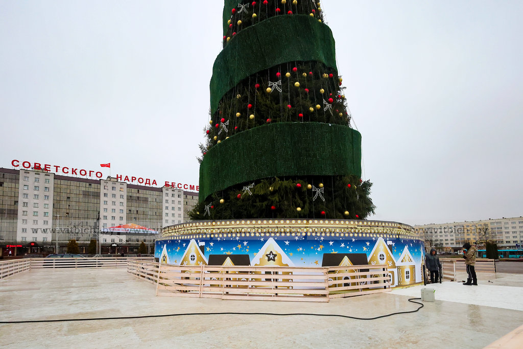 Сейчас вокруг главной городской новогодней елки пока еще рабочая обстановка, но уже отчетливо просматриваются контуры будущего ярмарочного веселья.