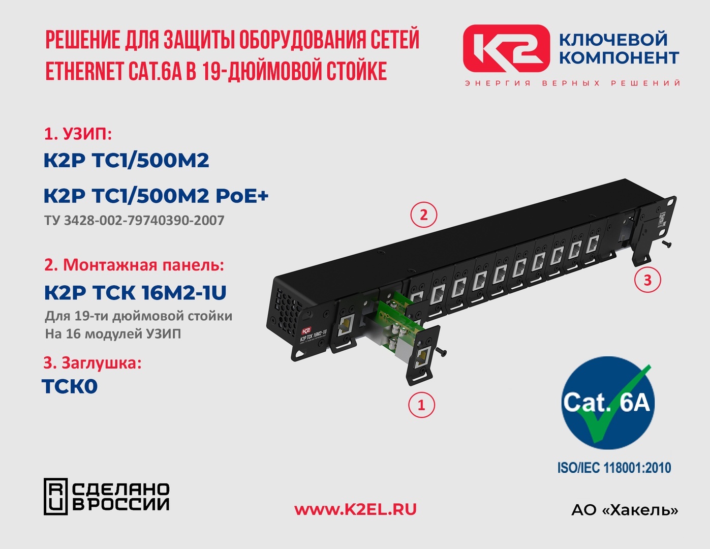 АО «Хакель» разработало серию УЗИП К2Р ТС1 М2 под ТМ «Ключевой Компонент», поддерживающих работу в сетях категорий Cat.6A. УЗИП устанавливаются в монтажную панель К2Р ТСК 16М2-1U для 19-ти дюймовой стойки в разрыв защищаемых линии.
