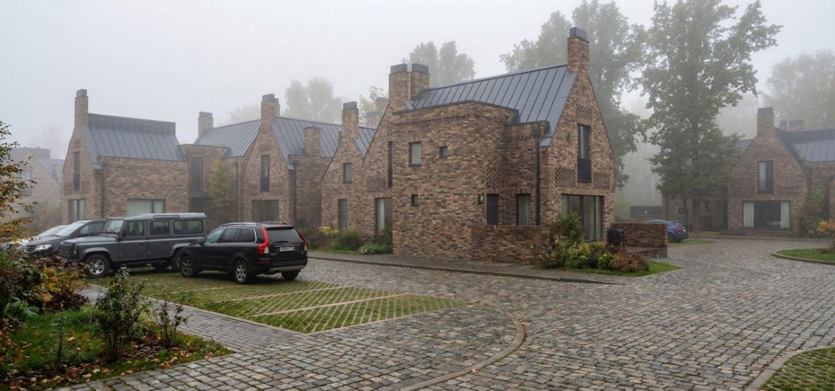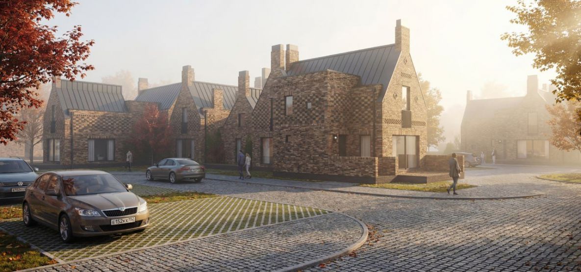 Блокированные дома объединены эстетикой классической кирпичной кладки. Их фасады выполнены из кирпича разнообразных оттенков коричневого с темной цементной расшивкой, что создает выразительную текстуру. Кровлю предложили сделать фальцевой, а дороги и пешеходные зоны — вымостить брусчаткой.