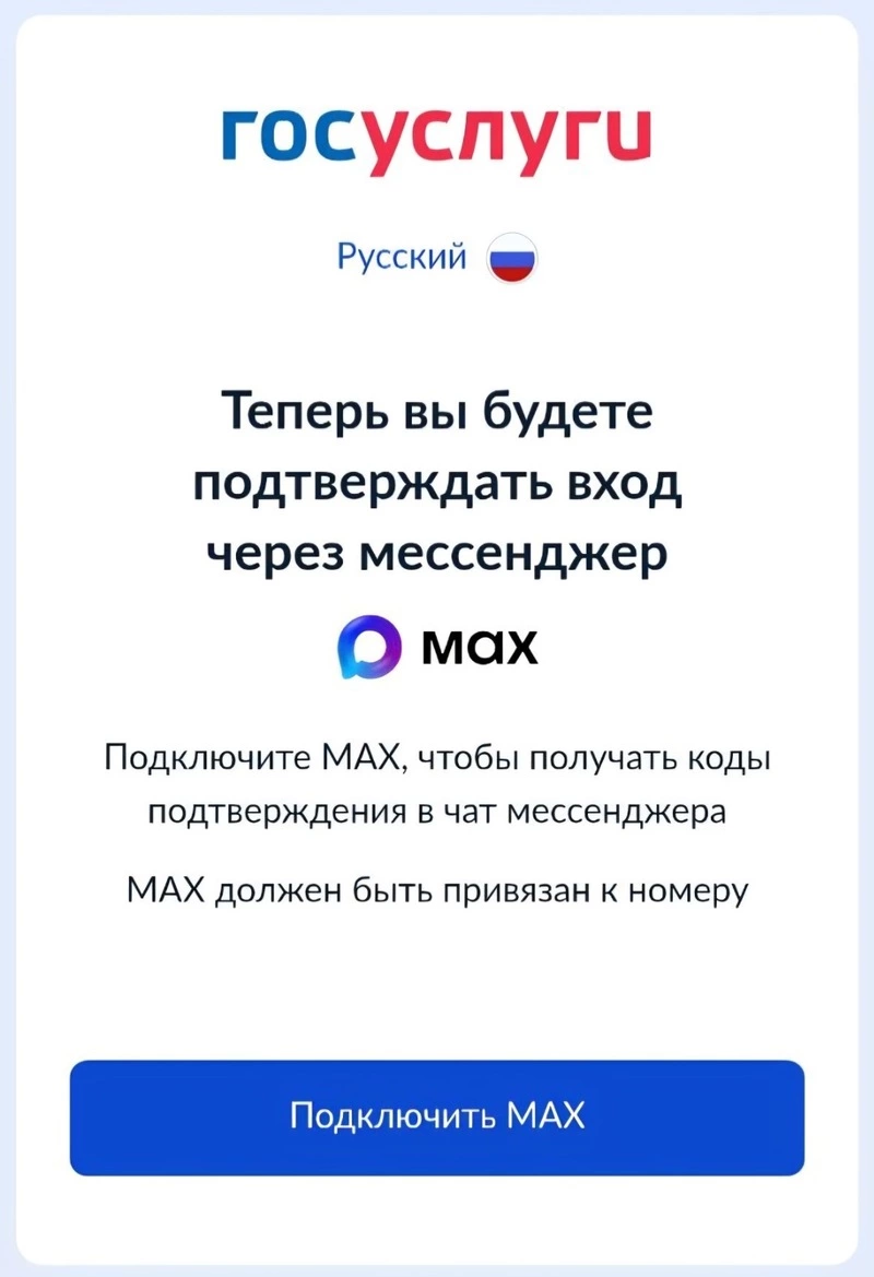 Ранее при входе на Госуслуги всплывало предложение настроить получение одноразовых кодов через MAX, но внизу была кнопка «пропустить».