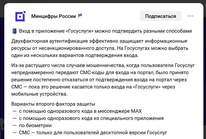 Двухфакторная аутентификация стала обязательной ещё осенью 2023 года. Пользователи могут выбирать между разными типами подтверждения, но ведомство продолжает смещать акценты в сторону более защищённых методов. Ещё в 2025 году Минцифры заявляло, что одноразовые коды через Max проходят тестирование.