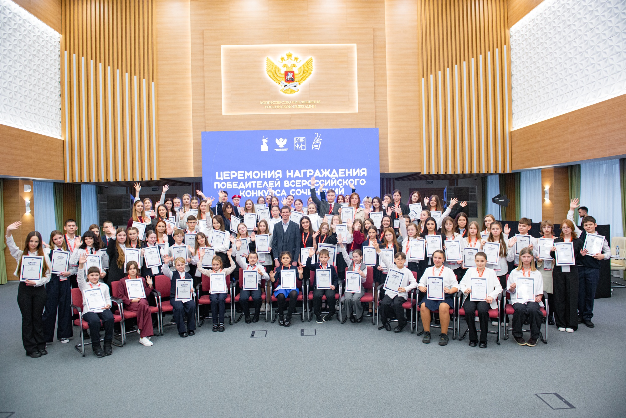 На площадке Министерства просвещения Российской Федерации 5 декабря состоялась торжественная церемония награждения авторов лучших работ Всероссийского конкурса сочинений – 2025. Мероприятие объединило 100 финалистов из 59 регионов страны. Участников приветствовали советник Президента РФ, председатель Совета по реализации государственной политики в сфере поддержки русского языка и языков народов РФ Елена Ямпольская, заместитель Министра просвещения РФ Ольга Колударова и заместитель председателя Комитета Совета Федерации по науке, образованию и культуре Елена Писарева.