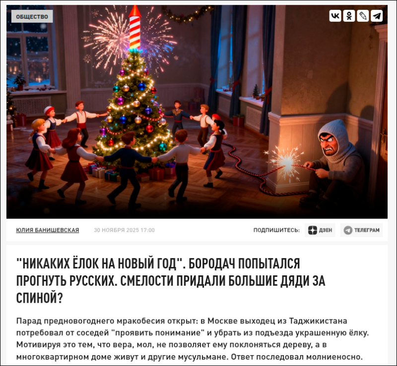 Новость быстро разнеслась по городу и спровоцировала взрыв общественного мнения. "Много жалоб"? Уж не от таких ли жителей, как "москвич" из Таджикистана, который недавно пытался запретить ёлку в подъезде столичного ЖК? Видите ли, смотреть на новогоднее дерево ему не позволяют его религиозные убеждения. Как выяснил Царьград, мужчина приехал из Таджикистана, открыл в Москве ИП, плотно сел на госконтракты и настолько поверил в себя, что попытался испортить соседям праздник.