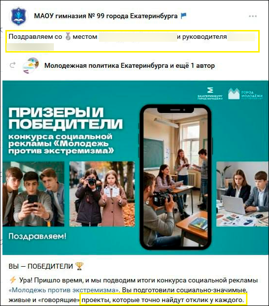 Екатеринбургская школа сначала порадовалась успеху своей ученицы, а после конфуза удалила пост из соцсетей. Скриншот поста из ВК-сообщества "МАОУ Гимназия №99 города Екатеринбурга"