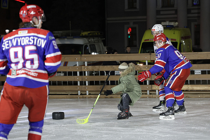 А хоккейная команда «Красная машина» вместеАлексеем Ковалёвымсыграла с тульской детской командой «Тигры» под выступление финалистки «Голос. Дети» и победительницы конкурса «Детская Новая волна»Анны Волковой.