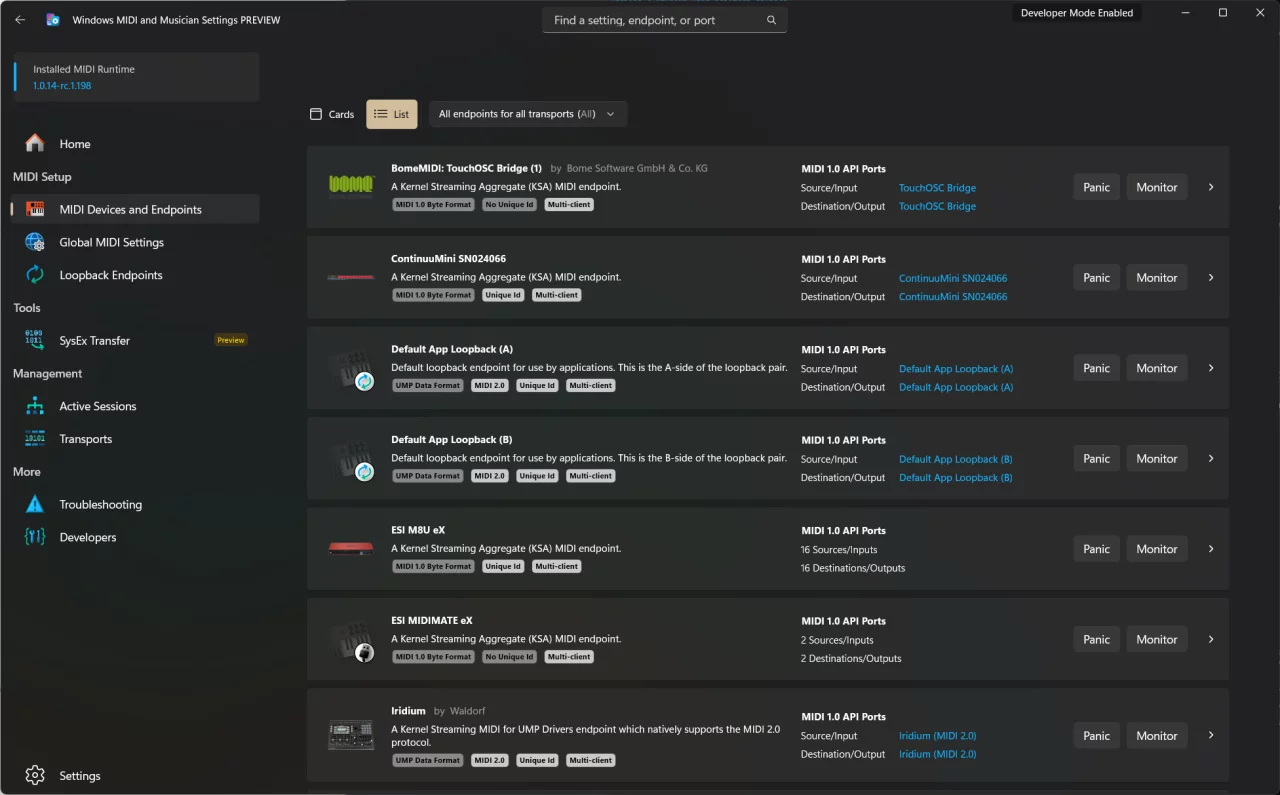 Пакет App SDK и инструменты доступны для отдельной загрузки. Он позволяет приложениям использовать встроенные функции MIDI 2.0, а также предоставляет инструменты для управления вашей MIDI-конфигурацией в Windows, включая «Консоль MIDI» и приложение «Параметры MIDI».