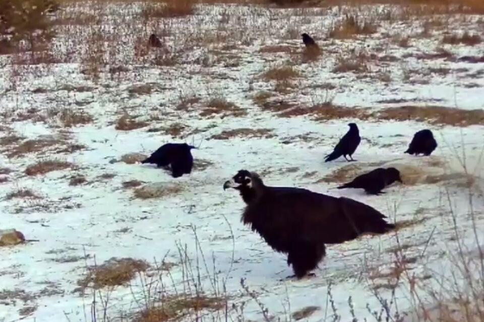 Фотоловушка в Забайкальском крае зафиксировала черного грифа, который находился в компании ворон. Об этом сообщили в пресс-службе Минприроды региона.