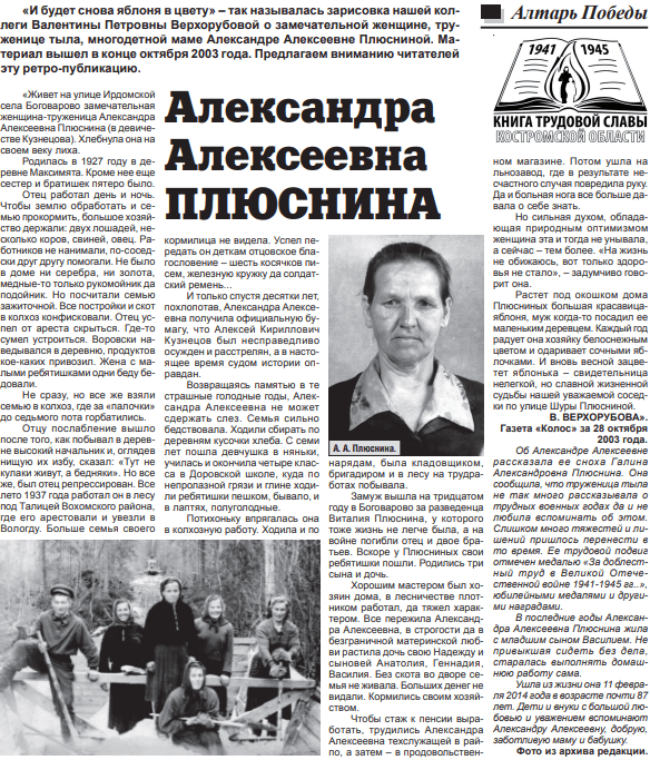 Редакция газеты «Колос» Октябрьского округа ведет публикацию материалов о тружениках тыла. На сей раз вниманию читателей представлена ретро-публикация об Александре Алексеевне Плюсниной. Рассказ о труженице тыла дополнила сноха Галина Александровна Плюснина.