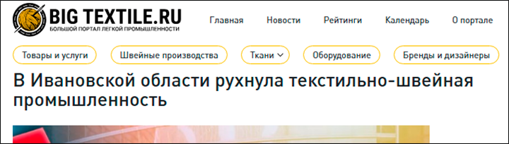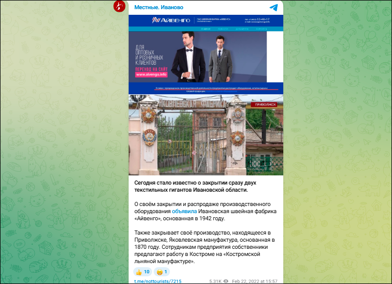 Лёгкая промышленность в Ивановской области близка к обмороку, и кризис там прогрессирует давно. Так, ещё в 2022 году закрылись две старейшие в регионе швейные фабрики – основанная в 1942-м "Айвенго", ещё недавно одевавшая всех ивановских чиновников и школьников половины России и Казахстана, а также "Яковлевская мануфактура", работавшая с 1870 года.