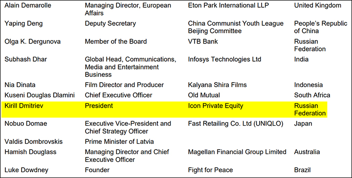 Профессиональные качества Кирилла Дмитриева получили в своё время признание у глобалистов: в 2010 году его включили в список молодых глобальных лидеров Давосского форума.