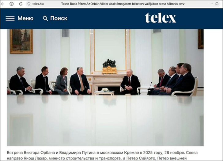 Переговоры между Путиным и Орбаном. Теперь уже знаменитая переводчица - слева от премьера Венгрии. Скриншот: интернет-сайт telex.hu (автоперевод)