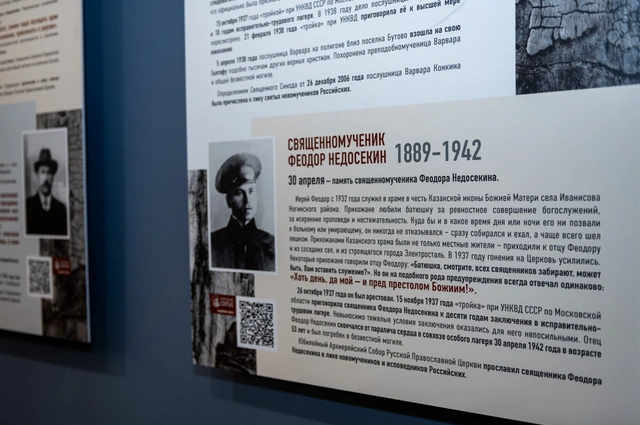 В экспозиции три раздела. Первый рассказывает о новомучениках Богородской земли, второй — о церковной «двадцатке» Богоявленского собора Богородска (Ногинска), а третий — о старосте Новосергиевского храма крестьянке Марфе Кондратьевой.