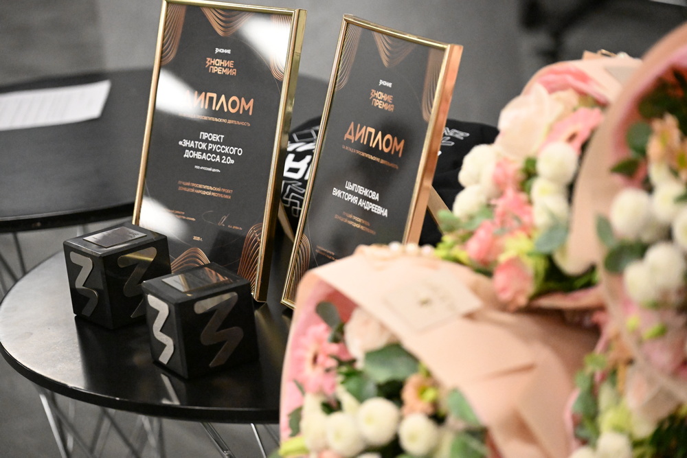 В завершение заседания Глава Республики вручил первые региональные награды «Знание.Премия» корреспонденту телеканала «Оплот» Виктории Цыпленковой как лучшему просветителю ДНР и исполнительному директору Региональной общественной организации «Русский центр» Елене Евсеевой за лучший просветительский проект «Знаток Русского Донбасса 2.0».