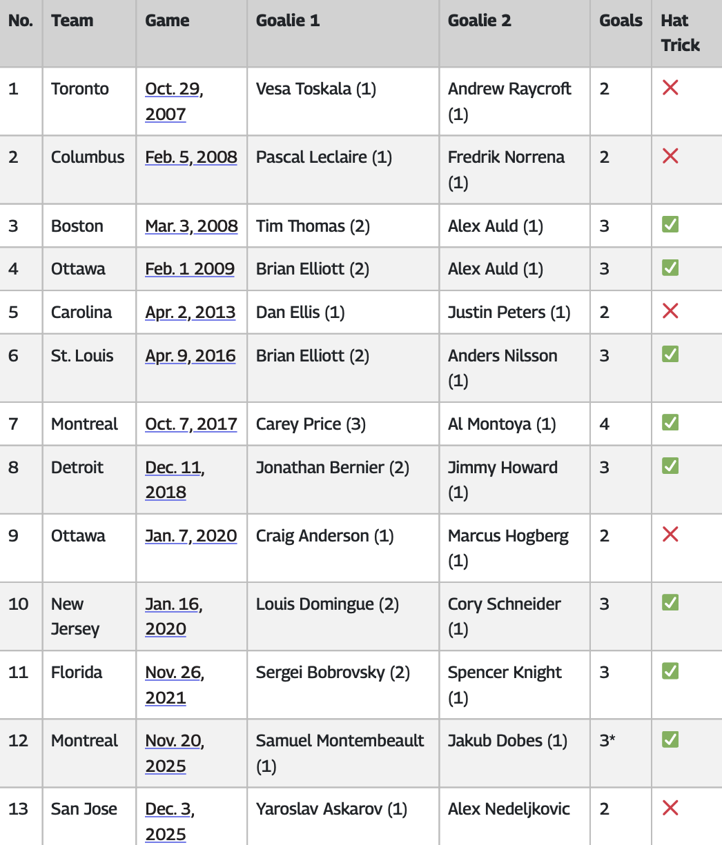 В истории НХЛ есть только два игрока, которые забивали обоим голкиперам соперника в одном матче чаще: Марио Лемье (21 раз) и Бретт Халл (16 раз).