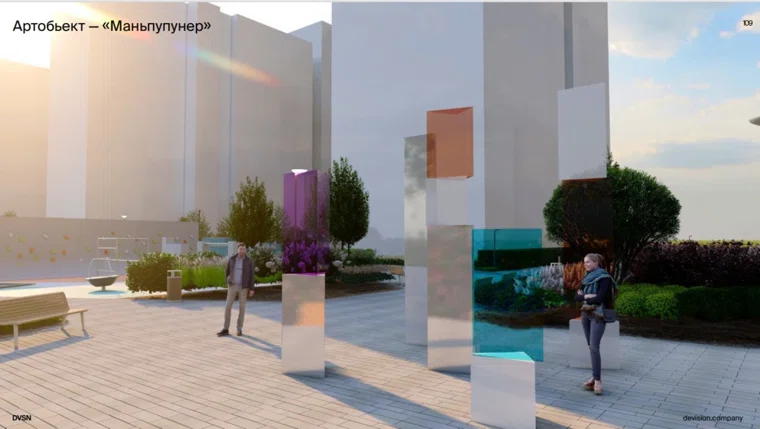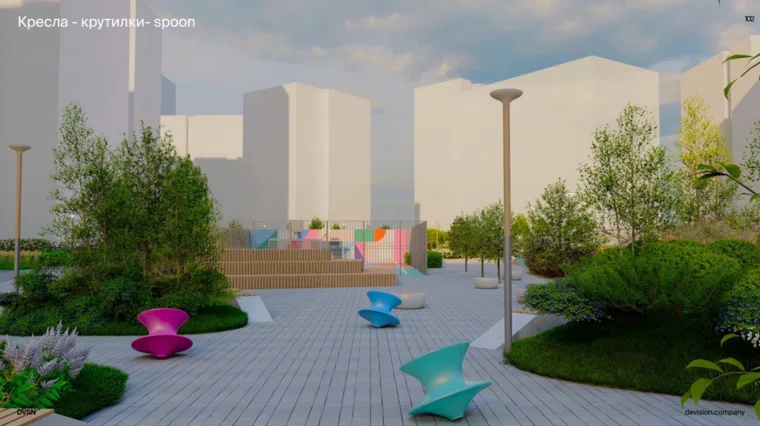 Главным же соединительным элементом всего квартала станет зелёный бульвар. Променад украсит весенняя цветущая вишня, превращающая его в уголок «Японского сада». Здесь же разместятся спортивные площадки, зоны для занятия паркуром и амфитеатр. Центр композиции составит оригинальный арт-объект «Маньпупунёр». Дополнительным украшением бульвара станут оригинальные кресла Spun, разработанные британским архитектором Томасом Хизервиком.
