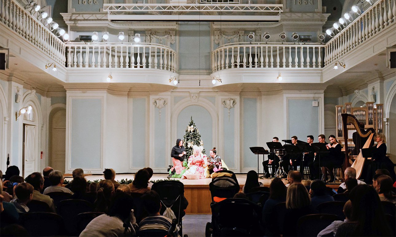 Праздничная программа начнется в 12:00 в фойе Большого зала, где гостей ждут сенсорные новогодние игры «Замыслы» и иммерсивный перформанс-сказка «Свет из кармана». Культурную часть в фойе дополнят балетные миниатюры в исполнении студентов Хореографического колледжа Ледях и сеансы мягкой музыкальной терапии, помогающие юным зрителям настроиться на восприятие искусства. Центральным событием дня станет концерт, который начнется в 13:00. Музыкальное исполнение «Волшебной флейты» Моцарта будет дополнено песочной анимацией.