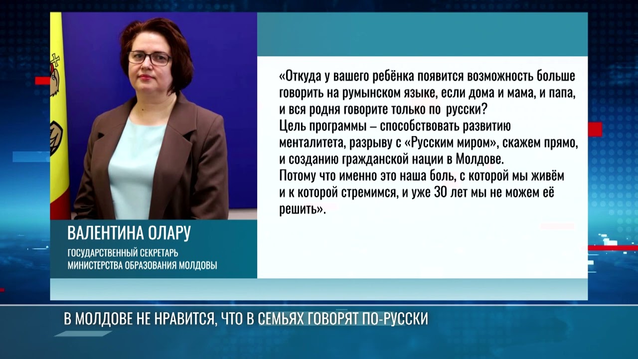 В Кишинёве не нравится, что в семьях говорят по-русски. Госсекретарь министерства образования Молдовы пропагандирует румынский язык. Она уверена, за ним будущее. И жалуется на родителей за то, что дома те говорят с детьми на русском языке.