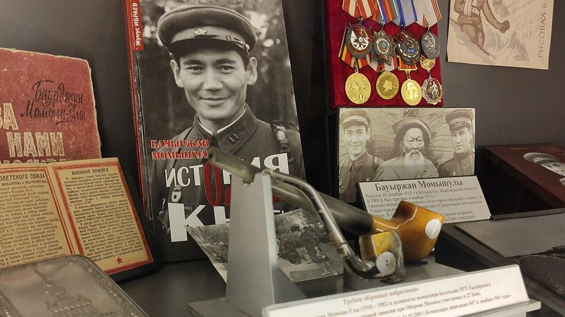 Стенд с экспонатами, посвященный Бауыржану Момышулы в Алматинском военно-историческом музее