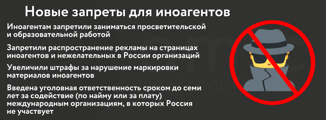 Весной 2025 года российская Госдума запретила иноагентам заниматься просветительской и образовательной работой вне зависимости от возраста обучаемого. Ранее иноагентам нельзя было обучать только детей.