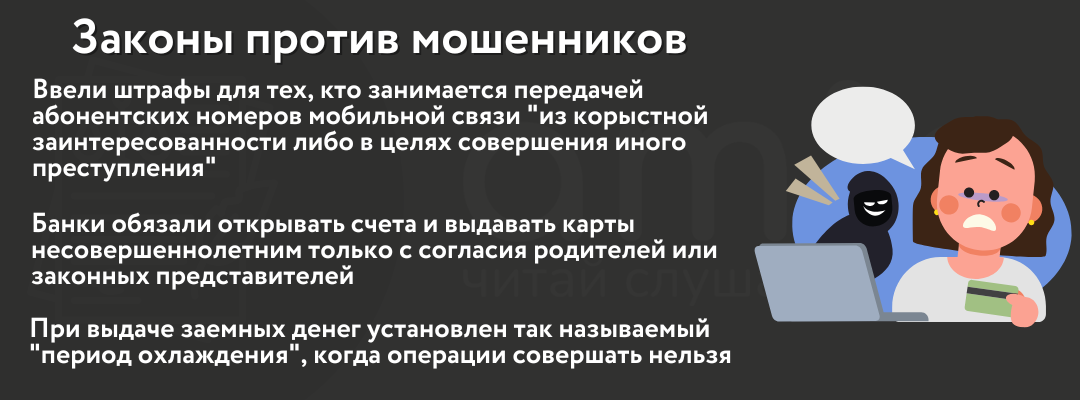 Еще банки обязали открывать счета и выдавать карты несовершеннолетним только с согласия родителей или законных представителей. А следователи и дознаватели теперь могут в рамках досудебного производства приостанавливать подозрительные операции не более чем на десять суток для последующего наложения ареста на средства.