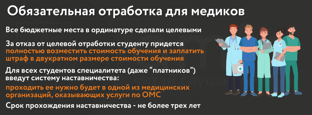 Также повсеместно ввели обязательное наставничество. Оно подразумевает, что отработки коснутся выпускников ординатуры, специалитета и медколледжей. После окончания вуза всем (даже тем, кто не получал целевого) придется отрабатывать. Однако санкции за отказ по сравнению с целевиками будут менее жесткими – а именно не прошедших практику выпускников не допустят к периодической аккредитации. При этом штрафы за отказ от отработки им не грозят. Мера может распространяться в том числе на студентов-платников. Место отработки студент сможет выбрать сам, однако там обязательно должны оказывать медпомощь по программе ОМС.