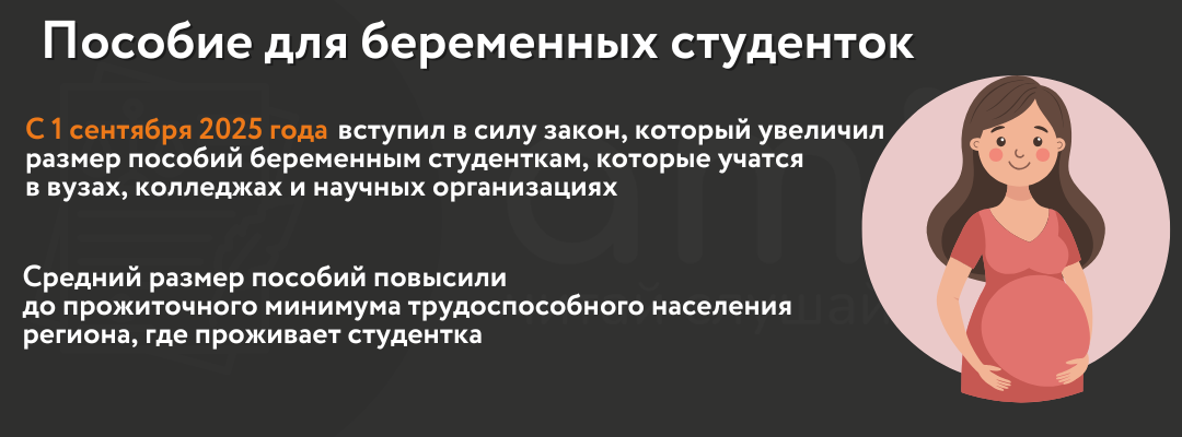 В июле 2025 года депутаты Госдумы приняли закон, который увеличил размер пособий беременным студенткам, обучающимся в вузах, колледжах и научных организациях. Средний размер пособий повысили до прожиточного минимума трудоспособного населения региона, где проживает девушка. Закон начал действовать с 1 сентября 2025 года.