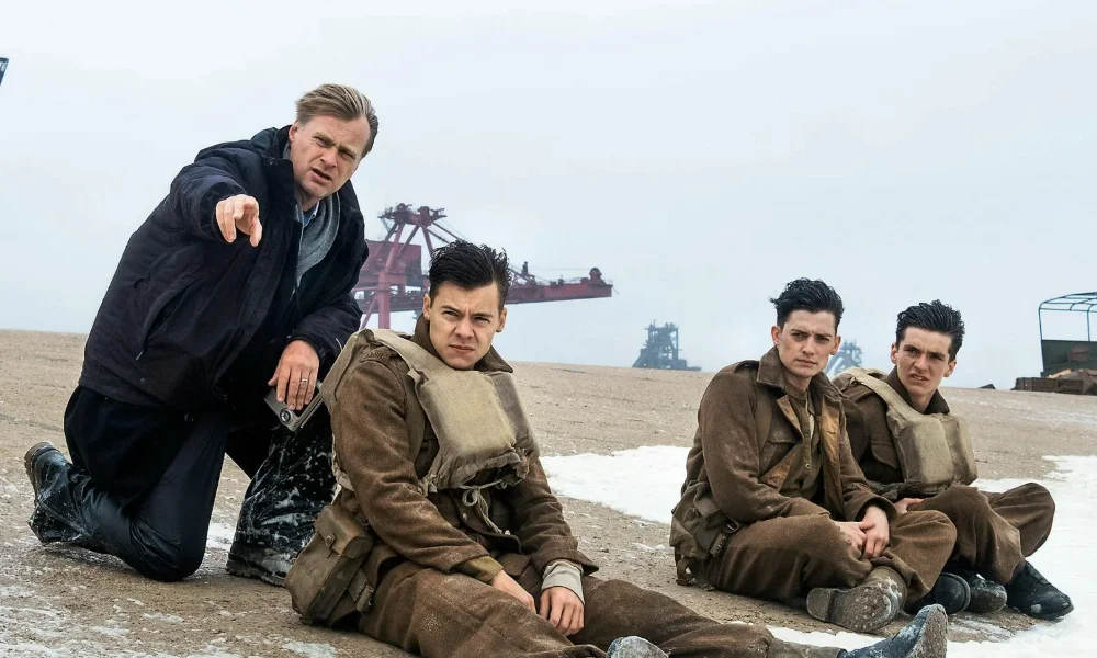 На берегу зритель знакомится с рядовым (Финн Уайтхед), на воде – с владельцем катера (Марк Райлэнс) и его сыном, в небе – с пилотом (Том Харди). Час полета приравнивается к неделе ожидания на пляже. Тарантино особенно выделяет это решение как одно из самых смелых в фильме – оно работает вместе со звуком и монтажом, формируя непрерывное ощущение давления, которое не ослабевает до финала.