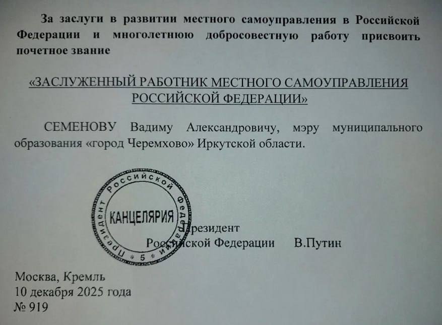 Указ о присвоении почетного звания мэру Черемхово подписал 10 декабря 2025 года президент Владимир Путин.