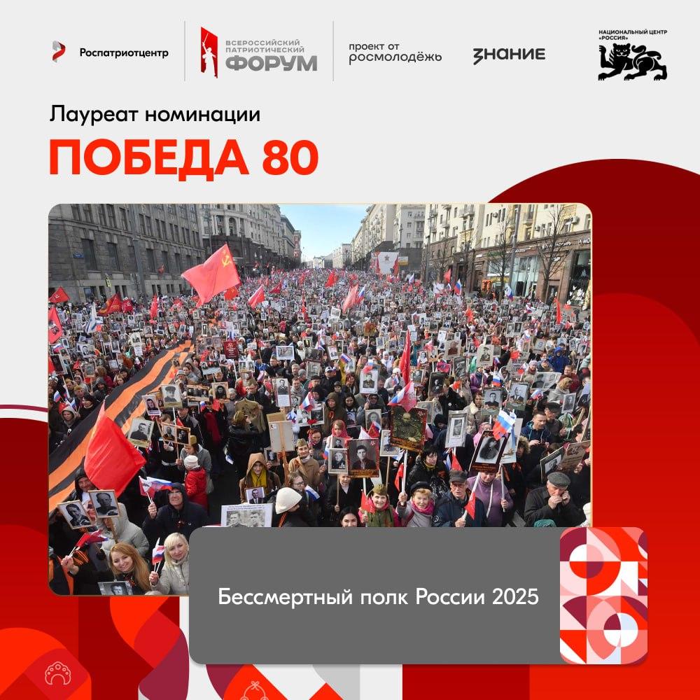 В номинации «Победа 80» — безусловный, неповторимый, единственный — Бессмертный полк России становится лауреатом Национальной премии «Патриот».