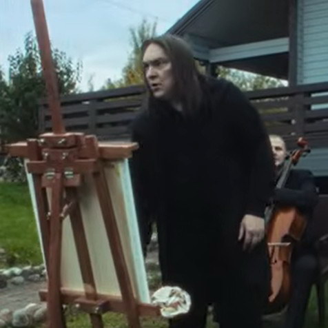 Там тоже просторно, но людно. В холле играет в шахматы Лев Толстой, в одной из комнат истово молится Гоголь, который зажёг столько свечей, что тревожному зрителю остаётся только надеяться, что деревянная недвижимость застрахована. Горшенёв подходит к балкончику, который на языке загородной архитектуры называется «второй свет»: именно оттуда оператор снимает поющую во главе с вновь оказавшимся на первом этаже Алексеем. Все смотрят на оператора, но ощущение, что на кого-то выше. Камера разворачивается и показывает кем-то принесённый на второй этаж мольберт, где наконец-то можно разглядеть, что нарисовал герой. Логично было бы увидеть на холсте стоимость коттеджа с отделкой и мебелью, но вместо этого Алексей Горшенёв изобразил чёрную жирную запятую.