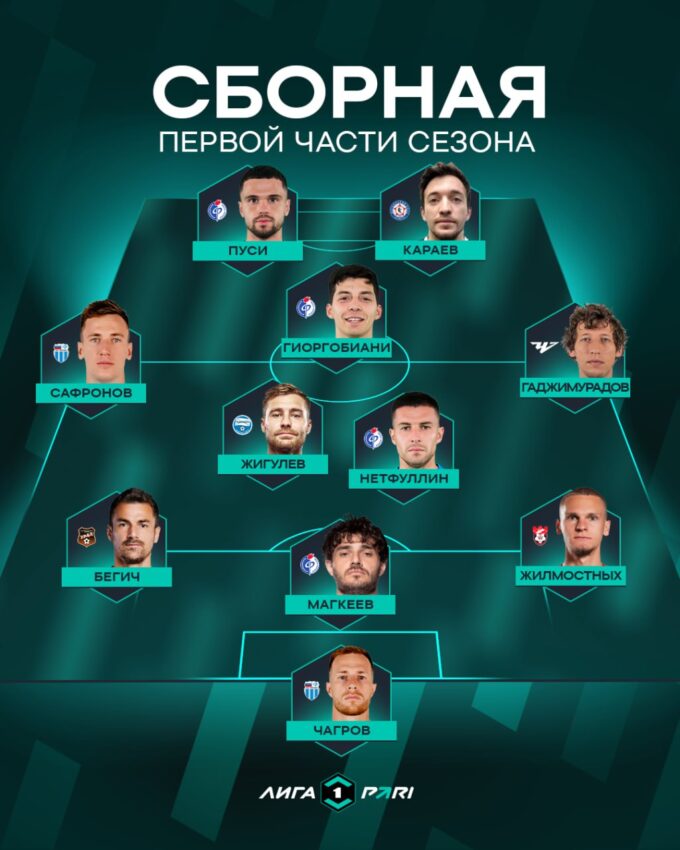 Разумеется, не мог не попасть в сборную первой половины сезона-2025/26 наш албанский нападающий Белайди Пуси. Именно он, забивший тринадцать голов, уверенно лидирует в споре бомбардиров первенства. Помимо «огнеопасного» квартета, в списке одиннадцати лучших игроков оказались: вратарь Никита Чагров («Ротор» Волгоград); защитники Силвие Бегич («Урал» Екатеринбург) и Денис Жилмостных («Спартак» Кострома); хавбеки Илья Сафронов («Ротор»), Илья Жигулев («Черноморец» Новороссийск) и Рамазан Гаджимурадов (ФК «Челябинск»); нападающий Давид Караев («КамАЗ» Набережные Челны).