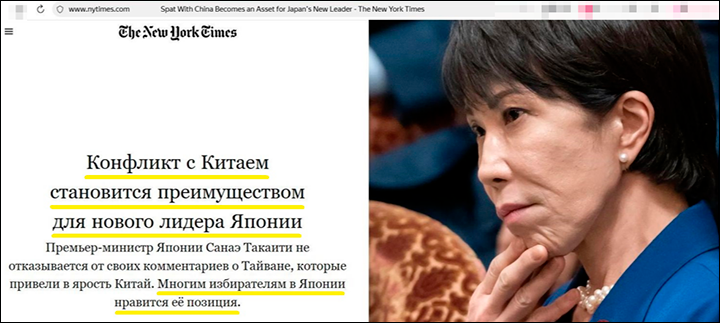 Не случайно американские СМИ поддержали конфронтацию Такаити с Китаем. Якобы своей "принципиальной позицией" премьер-министр отвечает запросу японского общества на внутреннюю консолидацию и повышение международного престижа страны. Мол, так держать, госпожа Такаити – и вдобавок ваши рейтинги взлетят…