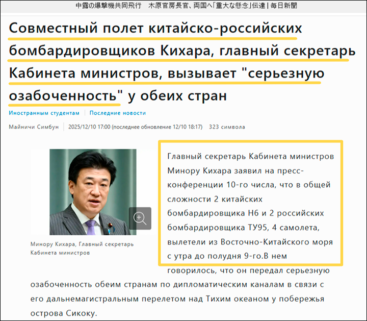 Так, Министерство обороны Японии "грозно" заявило, что действия России и Китая – "это демонстративные действия против нашей страны". Генеральный секретарь кабинета министров (то есть второй человек в правительстве) Минору Кихара официально сообщил следующее: