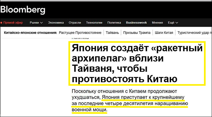 А местные эксперты откровенно заявляют, что Япония обязана поддержать США в ходе возможных столкновений из-за Тайваня: иначе, мол, останемся без ключевого союзника и будем беззащитны перед Китаем в будущем.