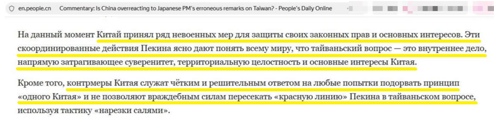 Пекин даёт понять как через официальные заявления МИД, так и через аналитические статьи в прессе, что вмешательство третьих сил в тайваньский вопрос – "это красная линия, за которую нельзя переступать".