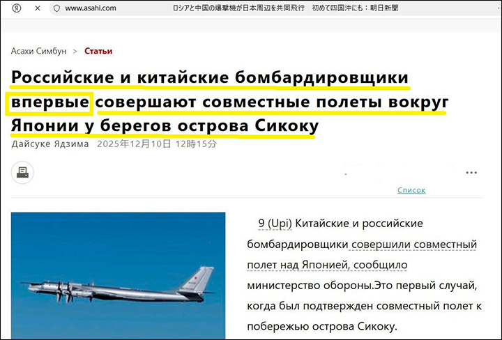 В Японии ночь с 9 на 10 декабря выдалась тревожной – Россия и Китай совершили совместный манёвр военной авиации почти над самым японским побережьем. Да не просто манёвр, а с применением "особенных" бомбардировщиков. "Спасибо" за беспокойные будни японцы должны сказать американцам.