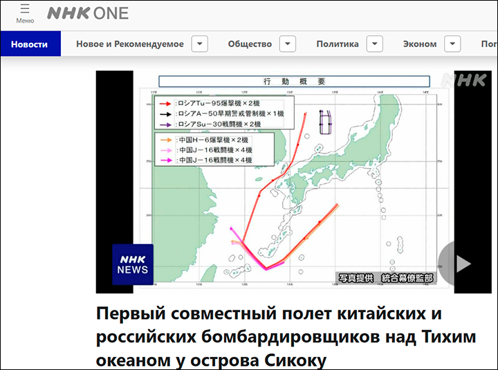 Маршрут военных самолётов России и Китая, по версии японских СМИ. Скриншот: интернет-сайт (news.web.nhk)