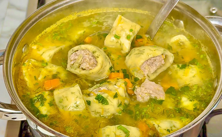 Посолите суп по вкусу. Теперь аккуратно опустите штрули в кипящий суп, стараясь не бросать их резко, чтобы они не развалились. После того как суп снова закипит, убавьте огонь до умеренного. Добавьте в кастрюлю овощную пассеровку из лука и тертой моркови, размешайте и варите еще 7 минут, пока тесто полностью не проварится, а фарш внутри штрули не дойдет до готовности.