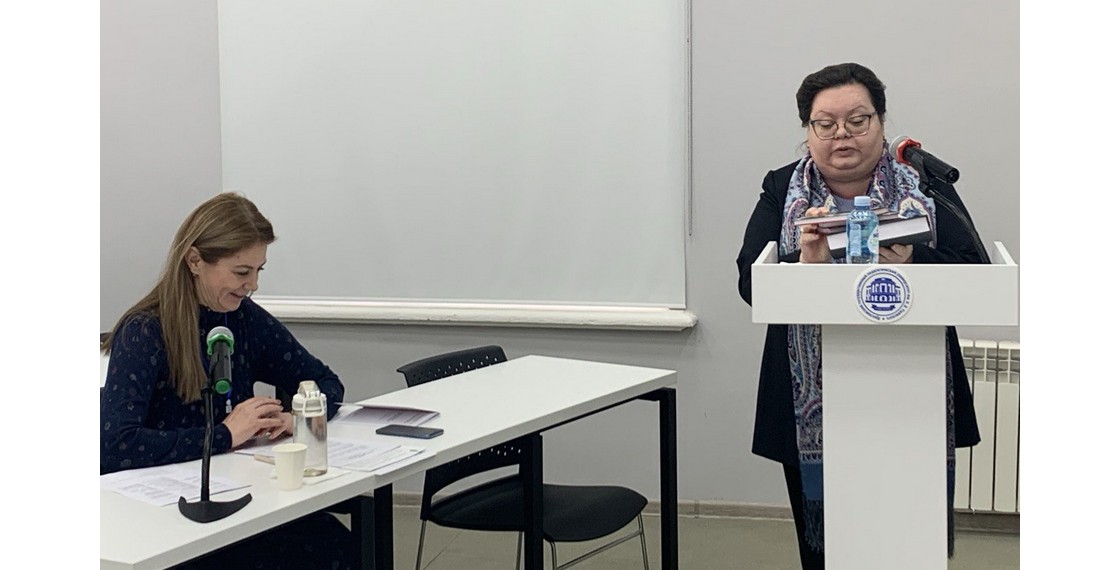 В президиуме конференции: декан факультета русской филологии и культуры Ж.К.Гапонова и заведующая кафедрой русской литературы Н.Ю.Букарева">