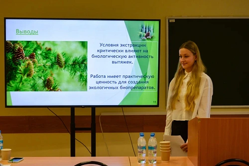 Ветошкина Злата, 9 кл., МБОУ СОШ№8, г. Ханты-Мансийск, руководитель - учитель химии Кельбер Роман Викторович. Тема проекта: «Исследование влияния условий экстракции на биологическую активность водных вытяжек хвои кедра сибирского» - I место