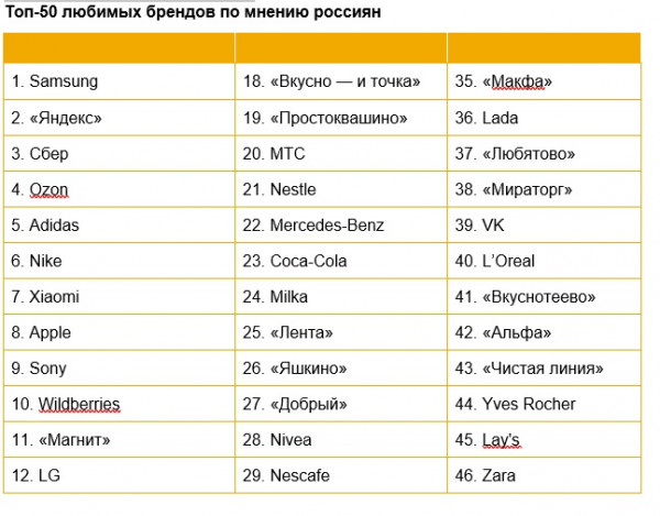 Аналитический центр НАФИ представил пилот исследовательского проекта «Топ-50 любимых брендов по мнению россиян». Исследование выходит при информационной поддержке мультимедийного холдинга РБК, при поддержке Ассоциации коммуникационных агентств России (АКАР) и основано на опросе 5 тысяч россиян. Результаты демонстрируют приверженность потребителей к крупнейшим цифровым и технологическим компаниям, а также к ключевым игрокам ритейла. В топ-5 списка вошли: Samsung, «Яндекс», Сбер, Ozon и Adidas.