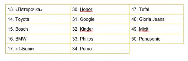 Производители товаров повседневного спроса (продукты питания, напитки, снеки — Coca-Cola, Nestle, «Простоквашино», «Мираторг», «Добрый», «Любятово» и др.) составили 36% списка, тем самым стали самым крупным кластером — россияне назвали 18 брендов из этой категории.